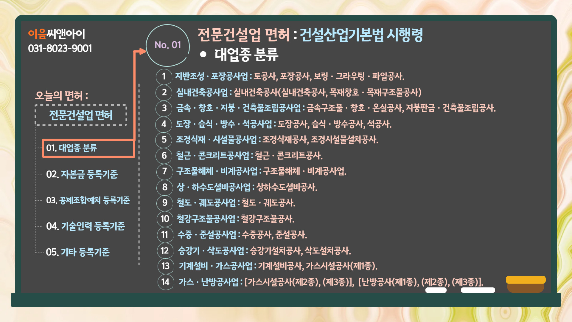 1. 전문건설업면허 : 건설산업기본법 시행령 - 대업종 분류.