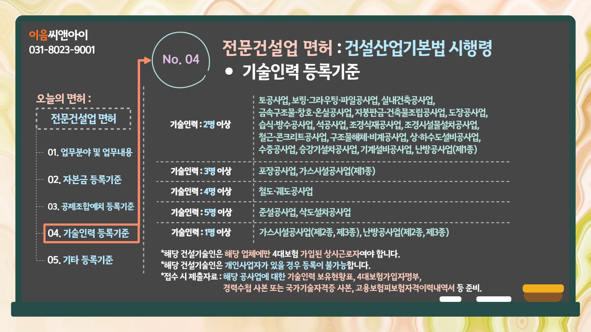 4. 전문건설업면허 : 건설산업기본법 시행령 - 기술인력 등록기준