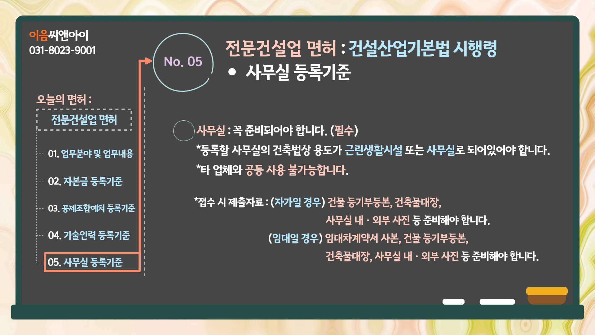 5. 전문건설업면허 : 건설산업기본법 시행령 - 사무실 등록기준