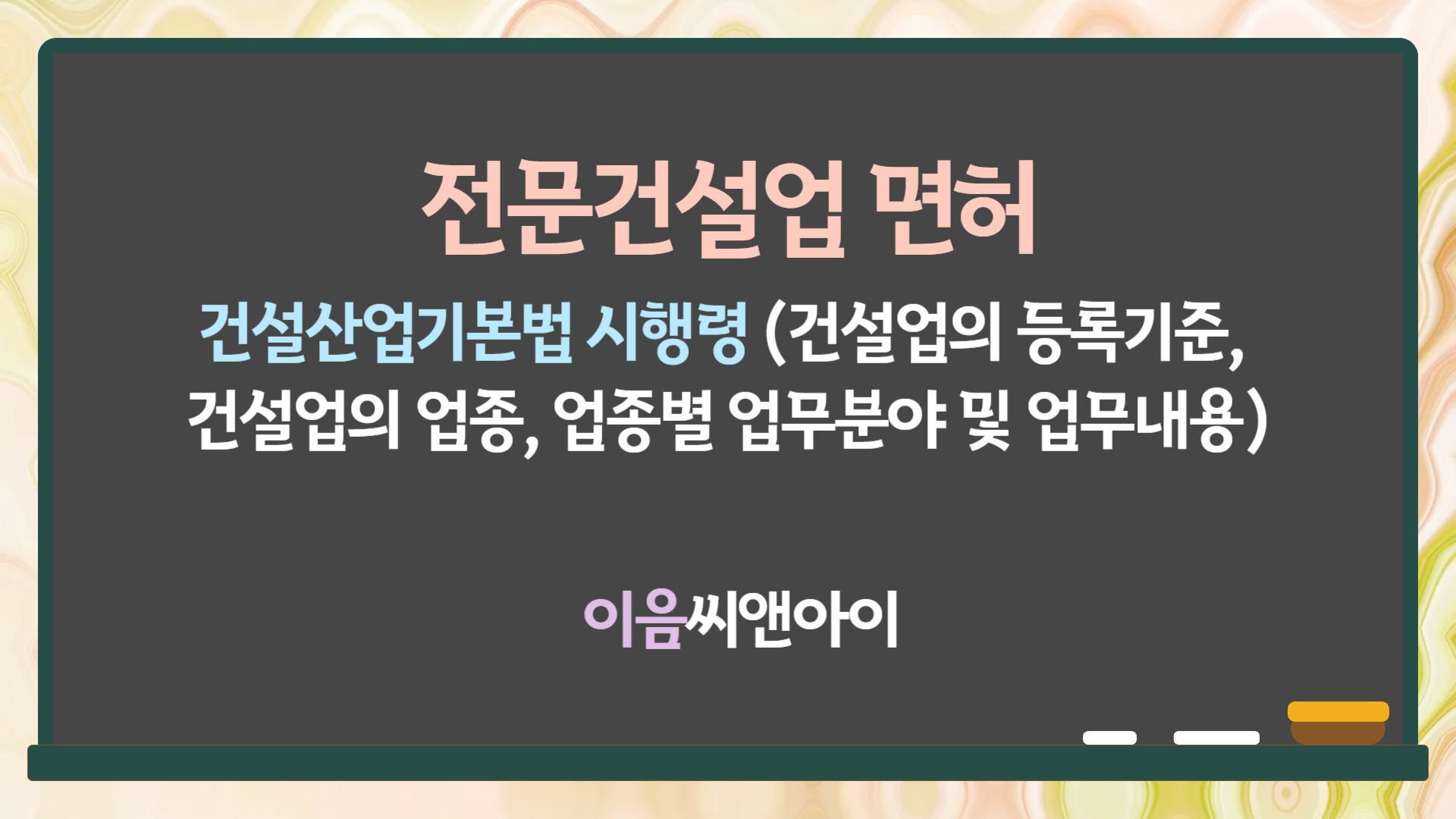안녕하세요. 이음씨앤아이입니다. 전문건설업면허 종류와 등록기준 요약정리 내용 확인하시고, 우리 업체에 필요한 공사업 면허는 무엇인지 취득하려면 준비해야 할 사항은 어떤 것들이 있는지 알아보시기 바랍니다.