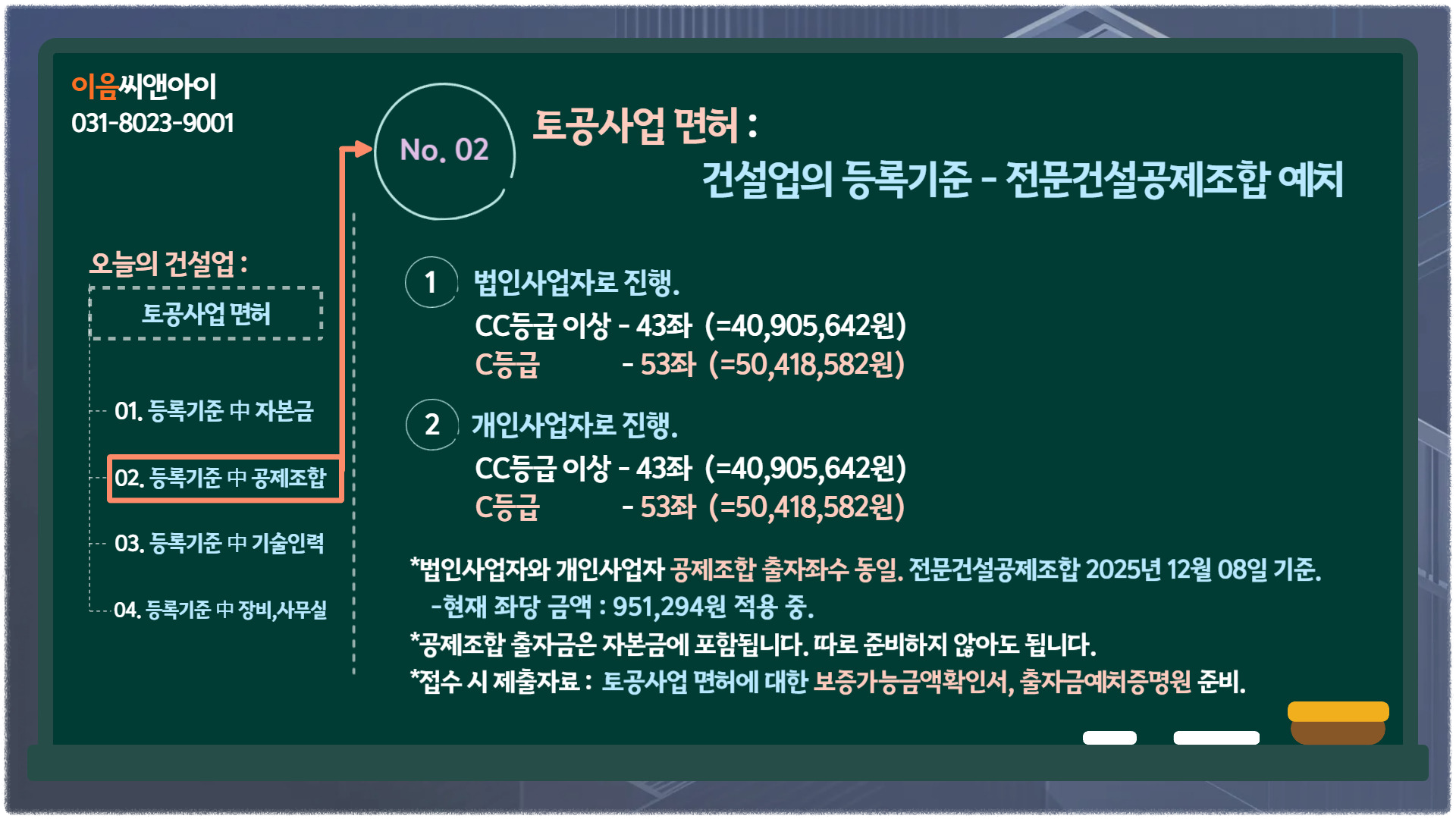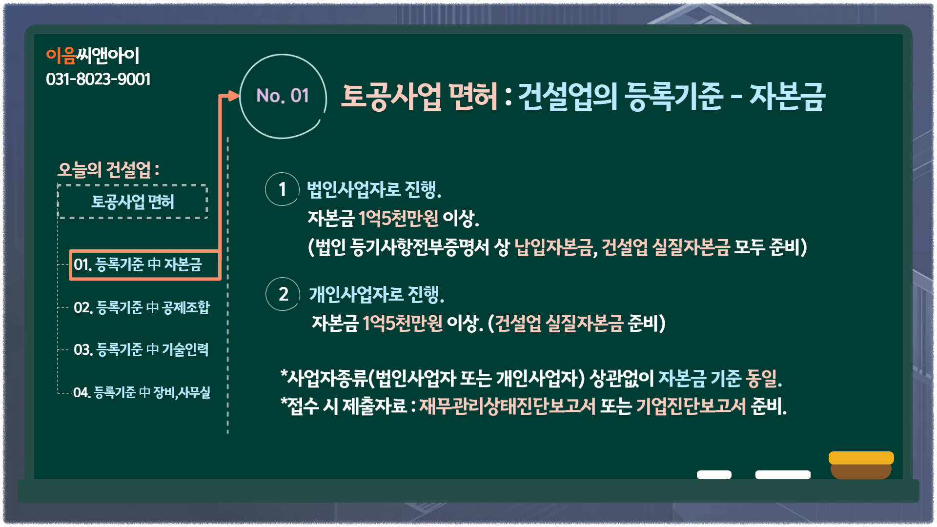 2. 개인사업자로 진행하는 경우 : 공사업 등록에 필요한 건설업 실질자본금 1억5천만원 이상 준비되어야 합니다.