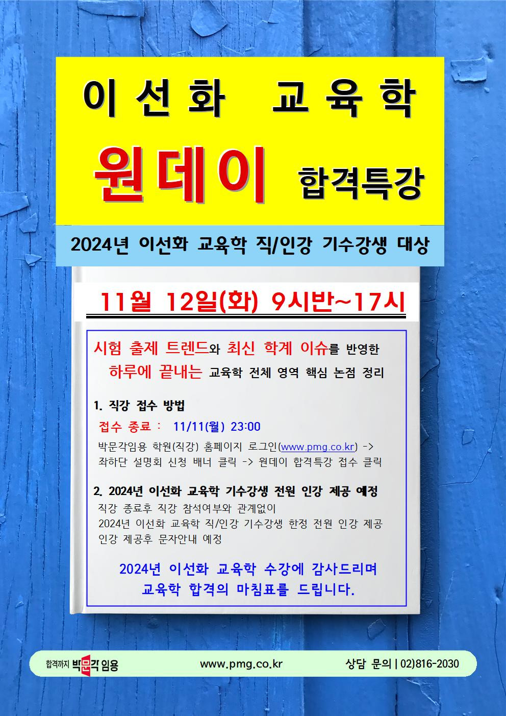 9~11월 강의계획서에 기공지된대로 2024년 이선화 교육학 직강, 인강, 직영상 수강생을 위한 ‘원데이 합격특강’ 직강 진행 및 인강 제공을 아래와 같이 안내합니다.