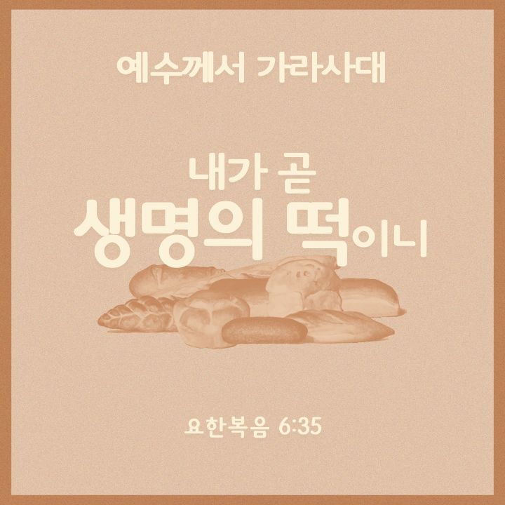 [요한복음 6:35] 예수께서 가라사대 내가 곧 생명의 떡이니 내게 오는 자는 결코 주리지 아니할 터이요 나를 믿는 자는 영원히