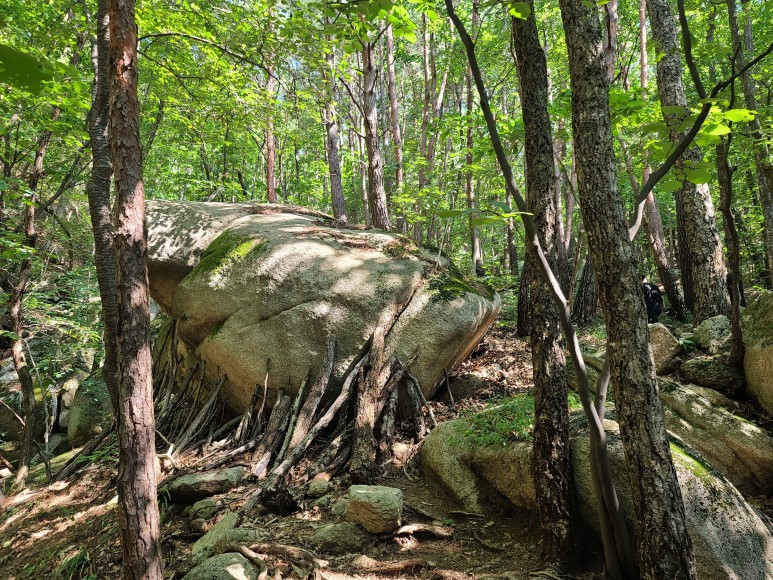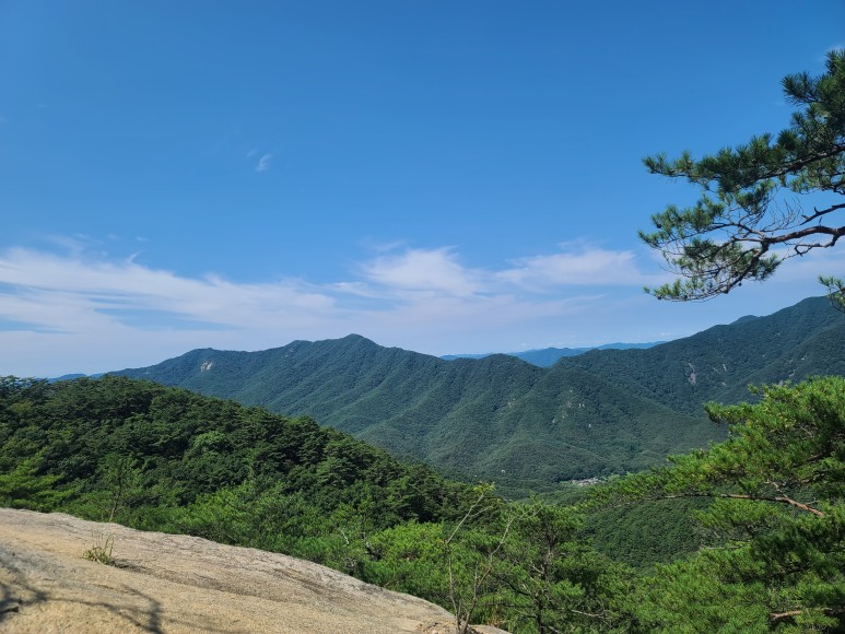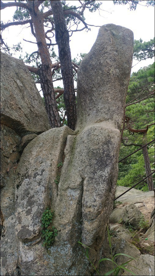 청석고개에서 정상까지는 0.6km 30분이 소요되는데 가파른 급경사도 있지만 중절모바위, 버선코바위와 군데군데 암릉과 노송이 어우러지며 시야가 트인다.