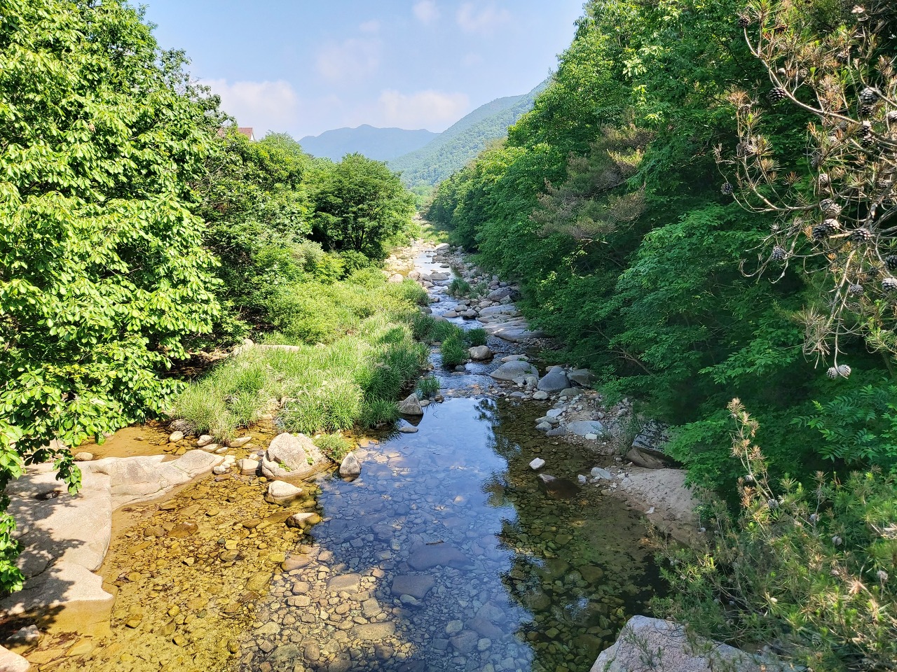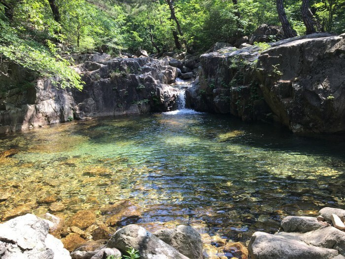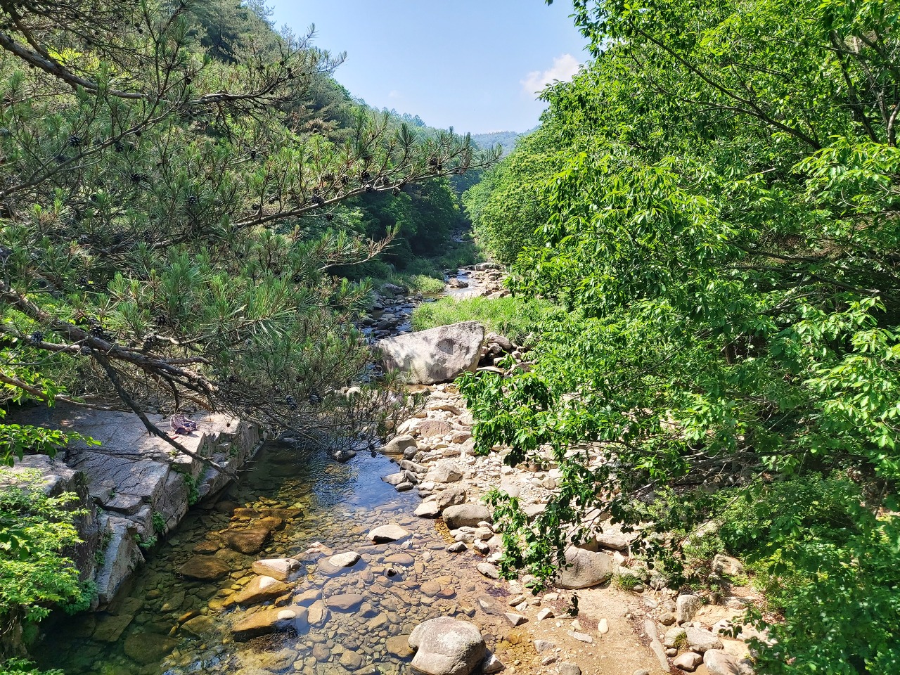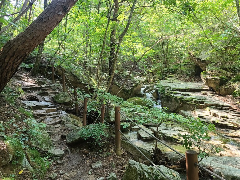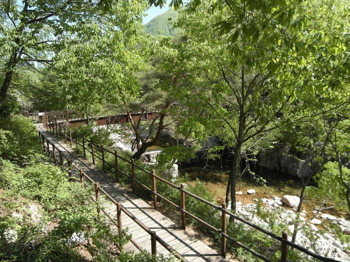 안부에서 20여분이면 계곡으로 내려서고 살구나무골 계곡합수지점부터 쌍곡휴게소까지 약 2.5km는 완만한 계곡길이다. 서너 번 징검다리로 계곡을 건넌다.