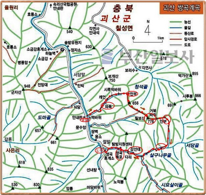 괴산군 칠성면 쌍곡리 칠보산 떡바위 출입문~목교~문수암골~청석재~칠보산 정상~거북바위~활목재~살구나무골~절말주차장·장성봉 갈림길~탐방지원센터~쌍곡폭포~탐방지원센터~쌍곡폭포산장 앞 주차장 갈림길~절말 마을~517번 지방도를 따라 칠보산 떡바위 출입문으로 되돌아오는 원점회귀이다.