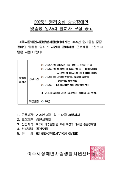 2025년 권리중심 중증장애인 맞춤형 일자리 참여자 모집공고 작성자여주놈|작성시간25.02.13|조회수95 목록 댓글 0 글자크기 작게가 글자크기 크게가 1.참여 신청서.hwp48.50KB2.개인정보 및 초상권 동의서 (1).hwp72.50KB3. 국민연금 사업장가입자 적용제외 신청서.hwp56.00KB 첨부파일첨부된 파일이 5개 있습니다. jpg 파일 사본-KakaoTalk_20250213_165124900.jpg 다운로드 etc 파일 blob 다운로드 hwp 파일 1.참여 신청서.hwp 다운로드 hwp 파일 2.개인정보 및 초상권 동의서 (1).hwp 다운로드 hwp 파일 3. 국민연금 사업장가입자 적용제외 신청서.hwp 다운로드 다음검색 현재 게시글 추가 기능 열기 북마크 공유하기 신고 센터로 신고 댓글 댓글 0 댓글쓰기 답글쓰기 댓글 리스트