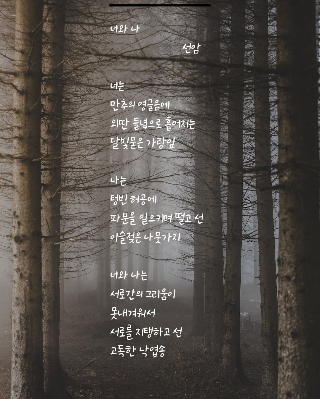 너와 나 작성자선암(宣岩)|작성시간24.11.26|조회수16 목록 댓글 0 글자크기 작게가 글자크기 크게가 이 시는 소꿉친구가 고3때 수능을 치르고 이화여대에 합격하여 서울로 가게 되어 이별하게 된 소꾼친구를 생각하며 지은 시입니다' 다음검색 현재 게시글 추가 기능 열기 북마크 공유하기 신고 센터로 신고 댓글 댓글 0 댓글쓰기 답글쓰기 댓글 리스트