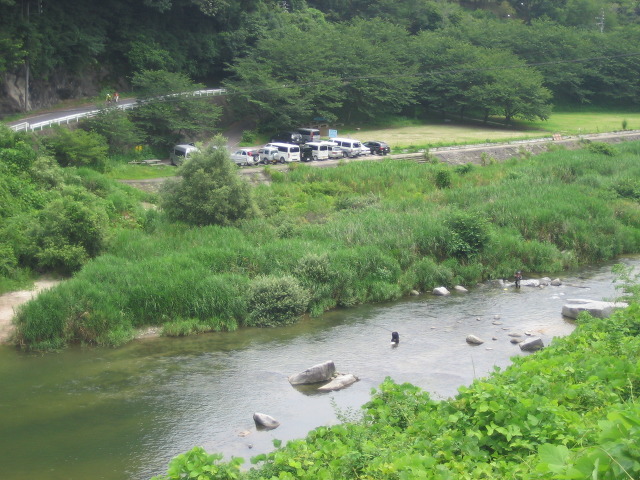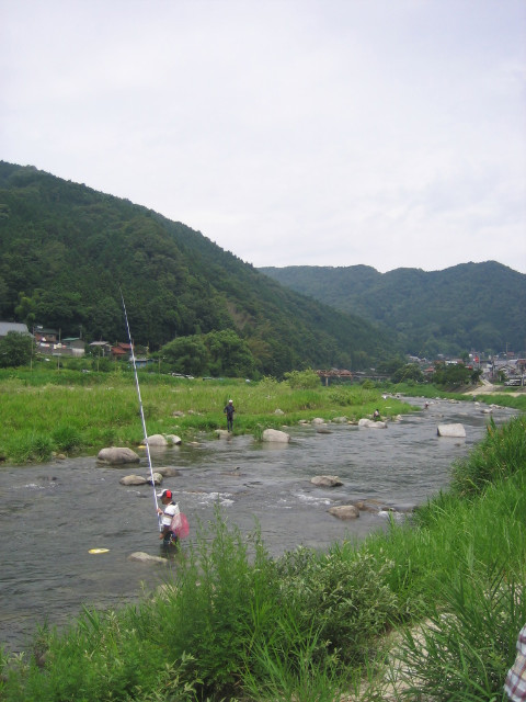 위에 보이는 계류를 따라서 많은 수의 은어낚시꾼이 있었습니다.