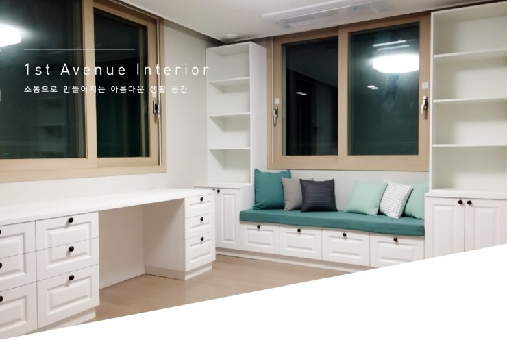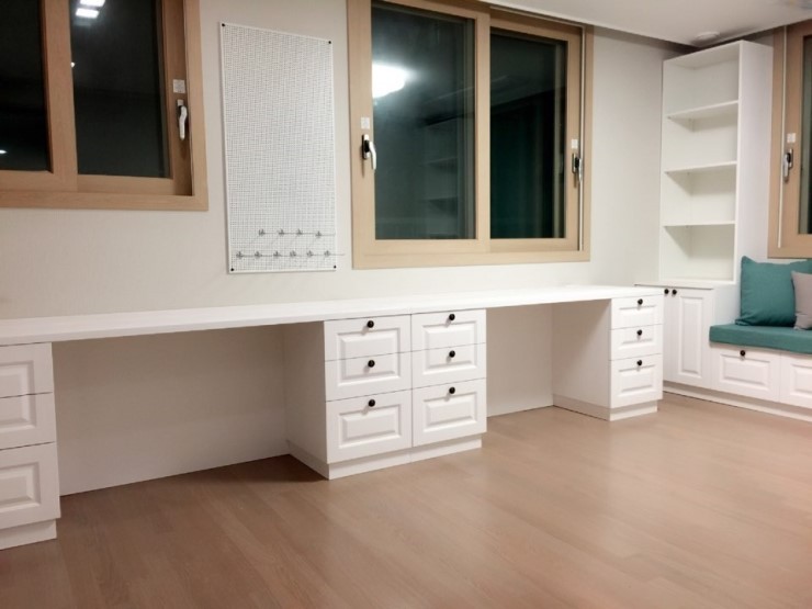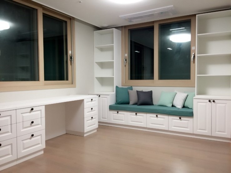 새아파트의 경우 공사 기간이 짧은 경우가 많습니다. 이럴땐 현장제작 부분과 외주 제작 부분을 나누게 되는데 두 방법 모두 장점과 단점이 있기 때문에 상담하는 과정에서 선택 할 수 있게 됩니다. 지금 보시는 서재가구는 외주에서 제작한 가구 입니다.