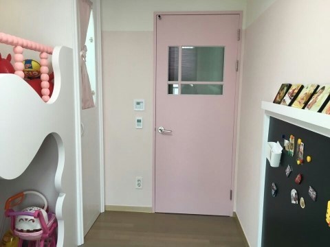 아이방 방문도 유리를 넣어 리폼했습니다. 방문이 닫혀 있어도 아이가 무엇을 하는지 볼 수 있어요.