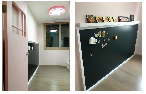 방문이 열리는 벽면은 아이의 키 높이에 맞는 큰 칠판을 만들었습니다.