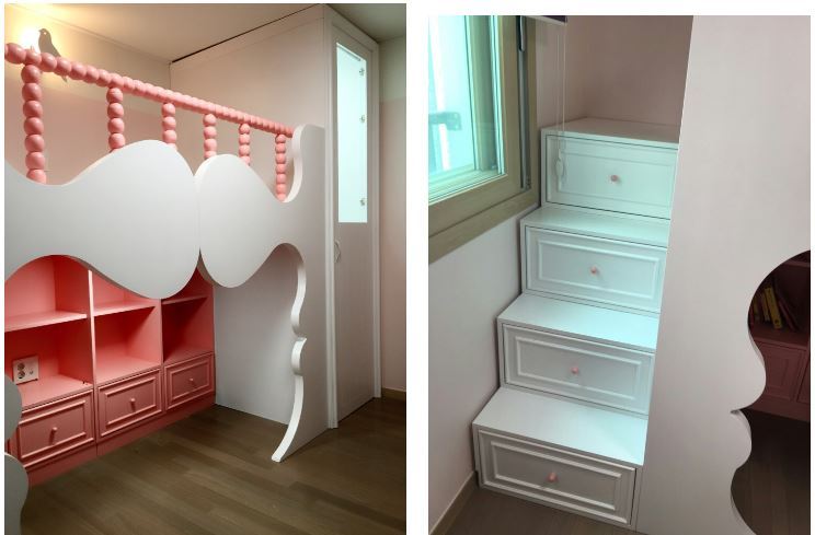 다락방 계단에 서랍을 넣어주고 1층에 책장에도 서랍을 만들었습니다. 어린아이들의 경우 자잘한 장난감이