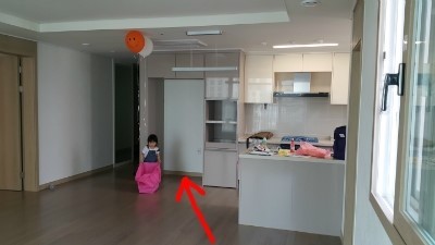공사전 느꼈던 불편함은 창고방과 주방을 연결하여 해결했습니다. 비포사진에 표현된 붉은 화살표 방향 그러니까 냉장고 뒤쪽 벽을 허물고, 기존에 있던 창고의 문은 가벽을 세웠습니다.