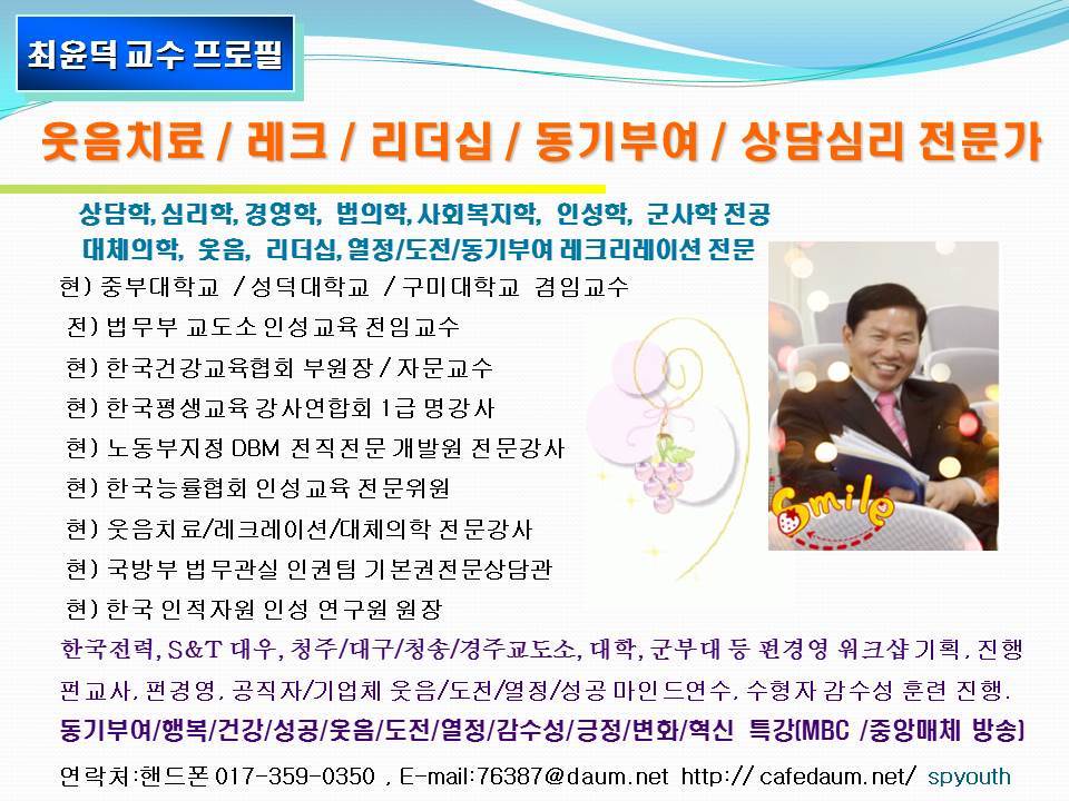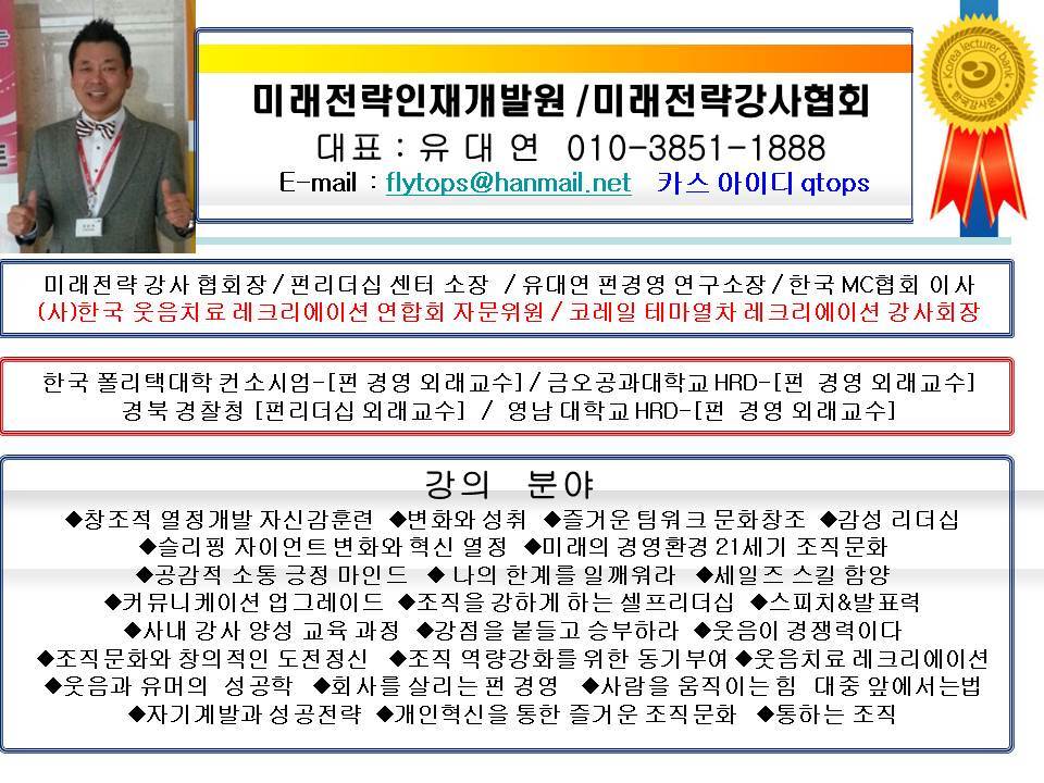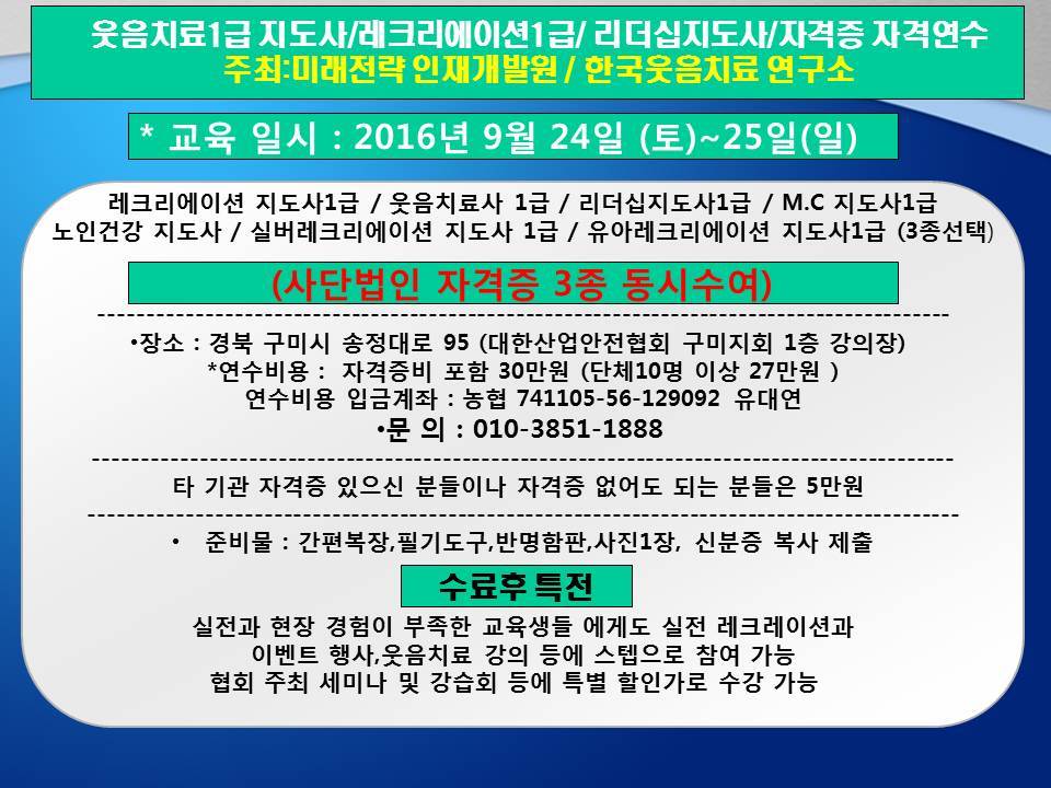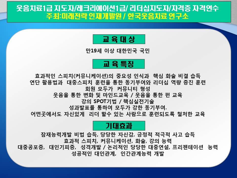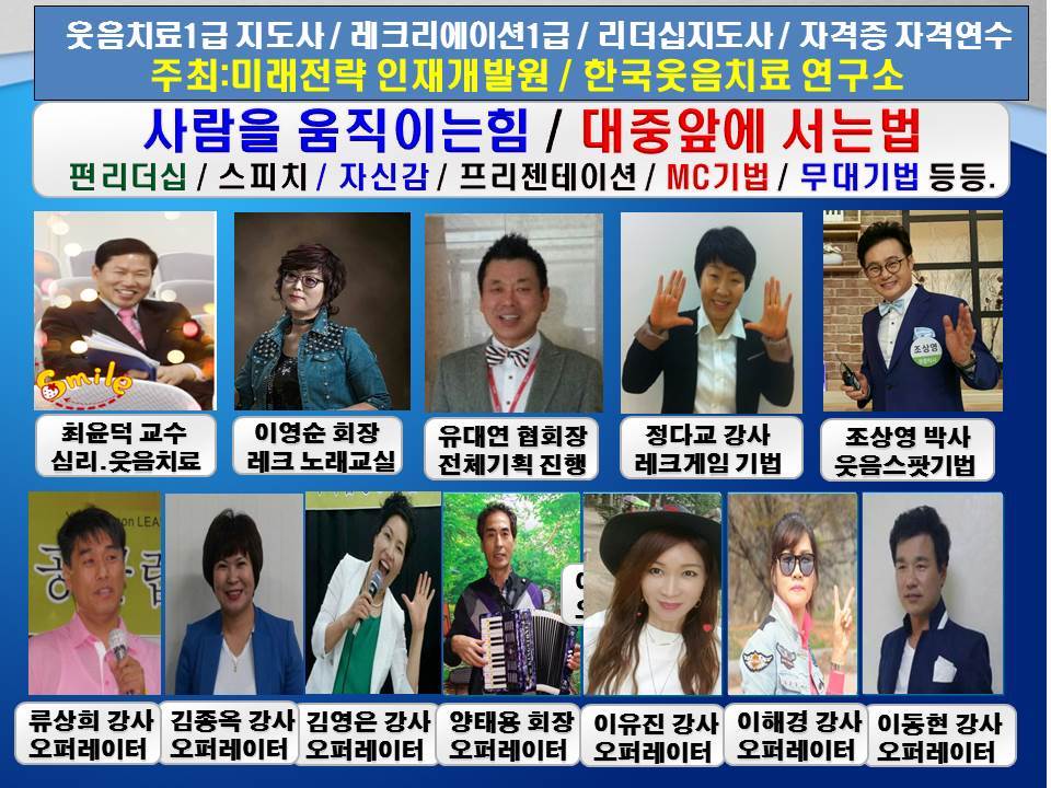 웃음치료1급 / 레크리에이션1급 / 리더십 지도사1급 / 자격연수