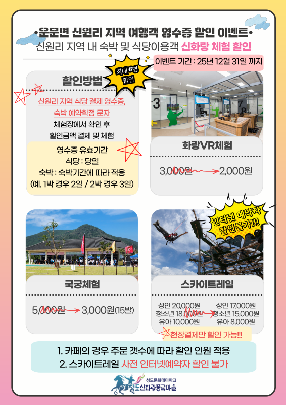 신화랑 체험할인안내 작성자캠장이모|작성시간25.06.05|조회수246 목록 댓글 0 글자크기 작게가 글자크기 크게가 6월부터 저희 연지곤지 이용하신 고객님들께서 청도 신화랑 풍륭마을 체험할인을 받으실수 있습니다연지곤지에서 캠핑도 즐기고 신화랑 풍류마을도 체험하시고 좋은추억 만들어 가시길 바랍니다 다음검색 현재 게시글 추가 기능 열기 북마크 공유하기 신고 센터로 신고 댓글 댓글 0 댓글쓰기 답글쓰기 댓글 리스트