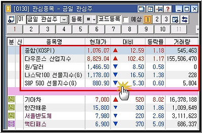 거래할때 관심종목창은 늘 한구석을 차지하고있기때문에... 맨 윗쪽에 관심있는 해외지수 혹은 환율등을 등록해서