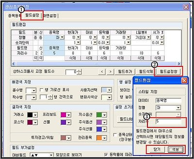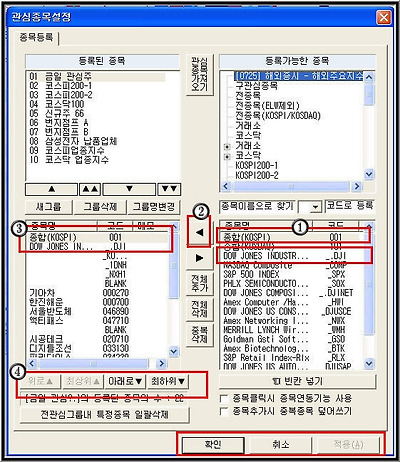 등록된 지수의 순서는 4번 메뉴를 이용하셔서 아래위 정렬시키시고...... 적용 - 확인으로 마무리 하시면 됩니다...