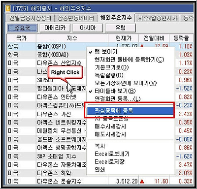 메뉴안에 마우스 오른쪽을 클릭하고 "관심종목에 등록"을 클릭하면 아래와 같은 메뉴가 나옵니다...