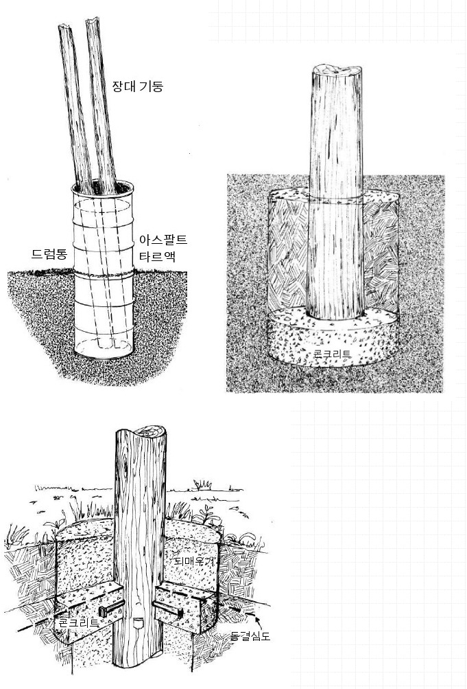가장 많은 질문 중의 하나는 땅 속에 박아 넣은 장대기둥의 부식 문제입니다. 그러나 장대기둥은 아스팔트 타르액에 충분히 담궈 처리하면 45~50년 이상 버틸 수 있다고 합니다.