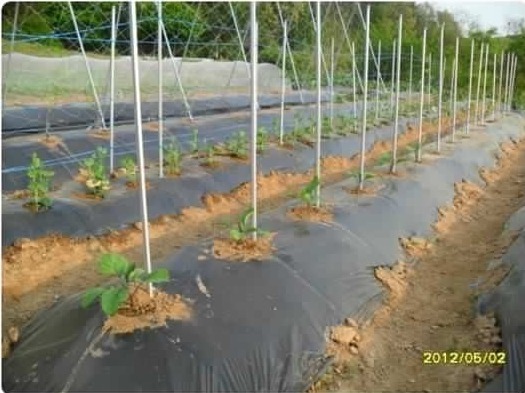 ▼ 가지 모종이 정식된 가지 이랑 - 1:1 지주대 설치