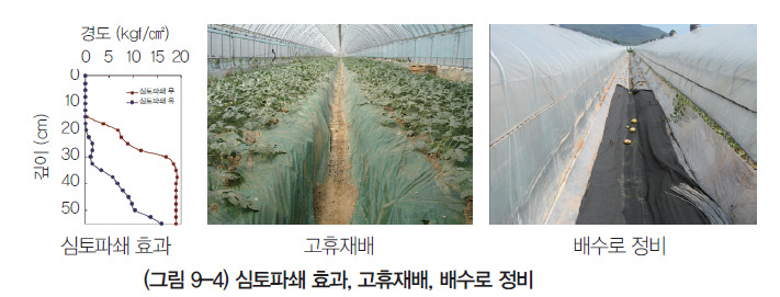·깊이갈이(심경) : 잦은 경운과 관수에 의하여 표토의 토양은 부드럽지만 30~40cm 아래에는 토양 교질이 결합하여 딱딱한 층을 형성하게 된다. 이것은 물빠짐과 통기성을 떨어뜨리고 양분이 표토에 집적되게 한다. 이에 대한 대책으로 작토층 확보를 위하여 심경을 한다. 또한 암거배수나 배수로를 정비하면 크게 도움이 된다.