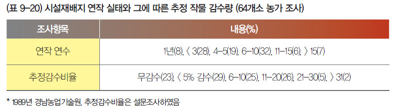 대부분 시설재배지 농가의 60% 이상이 5년 이상 재배지를 옮기지 않고 연속하여 재배를 하는 것으로 나타났다. 연작 장해의 피해는 작물의 수량 감소, 품질 저하, 생육 저하 등으로 나타난다. 연작에 의한 작물의 생육 저하는 여러 가지 복합적인 원인이 관여하여 나타나는 결과이므로 정확하게 판단하기 어렵고 산술적으로 나타내기 어려우나 과거에 비하여 수량이 감소하는 것을 농가들이 느끼고 있다(표 9-20).