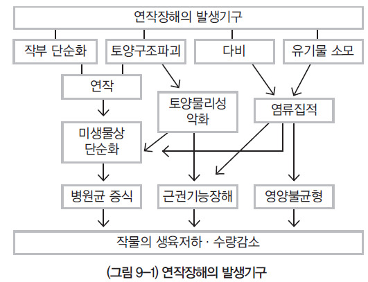 같은 작물을 연작하면 특정 미생물이 증가하고 단순화된다. 시설채소재배지는 휴한기의 토양은 극단적으로 건조해지고 염류제거를 위하여 담수시킬 경우 과습되어 미생물의 밸런스가 무너지게 된다.