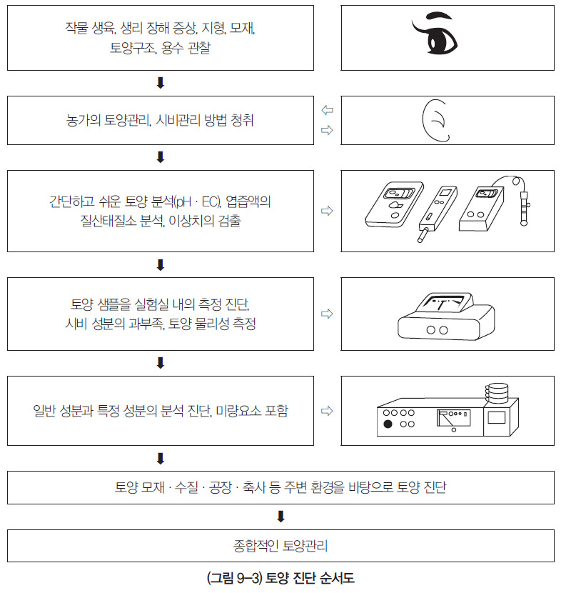 토양의 건전성은 작토의 깊이, 경도, 공극률 등의 물리적 성질, pH, EC, 양분의 과부족이나 균형 등의 화학적 성질 및 유기물의 부식정도나 여러 종류의 유용미생물의 활동 등의 생물적 성질에 좌우된다. 따라서 이들의 성질이 잘 조합된 토양을 만드는 것이 중요하다. 작물의 영향상태를 정확이 진단하여 안정생산, 증산, 고품질의 농산물 생산을 위하여 토양관리 대책을 마련하기 위해 토양 진단은 필수적이다. 토양은 변화가 둔하지만 장해 증상이 나타나면 회복시키기 어렵기 때문에 미연에 방지하는 것이 중요하다. 그러기 위해서는 작물과 작물영양상태를 동시에 진단하는 종합적인 토양관리가 필요하다. 토양이나 작물의 진단은 사람의 건강진단과 닮은 부분이 있어, 현장에 가까운 사람이 정보를 가장 많이 가지고 있다.