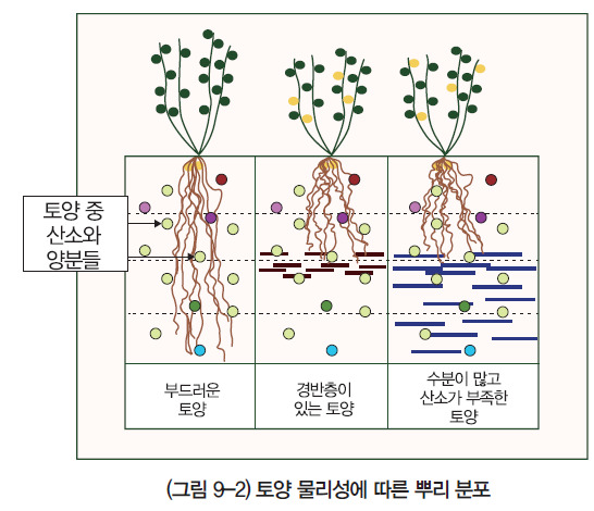 ·배수 대책 : 토양의 배수 불량에 의한 산소 부족은 작물에 습해를 일으킨다.과습 조건으로 유기물의 분해도 나쁘고, 환원성 유해물질이 발생하여 뿌리 생육을 나쁘게 한다. 뿌리의 건전성을 유지하기 위해서는 지하수위를 낮추는 것과 동시에 신속한 배수를 실시하는 것이 중요하다. 작물에 따라 뿌리 분포의 깊이와 내습성을 고려하여 암거배수나 펌프 등을 설치하여 지하수위를 낮출 필요가 있다. 그러나 암거배수나 펌프 설치는 비용이 많이 들기 때문에 지하수위를 낮출 수 없는 경우에는 이랑을 높게 하여 재배한다. 지표 배수는 명거배수로를 설치하며, 배수 대책은 포장의 입지 조건을 고려해야 한다.
