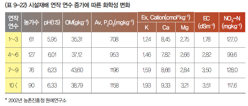 시설재배는 밀식된 상태에서 단위 수량을 높이기 위하여 비료 주는 양이 많아지는 데 비해 비료의 유실이 적어 염류가 집적되기 쉽다. 우리나라 시설재배지의 토양 화학성을 조사한 결과에서도 토양 염류농도가 작물생육에 적당한 2.0 dSm-1 이상을 나타내는 시설재배지가 61.2%나 된다. 질소, 인산