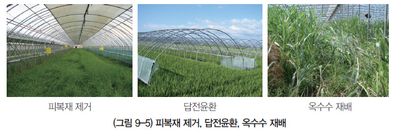 ·제염작물에 의한 제염 : 하우스재배의 휴한기를 이용하여 옥수수와 같은 제염작물을 짧은 기간 재배하는 방법이다. 연구결과에 의하면 시설재배지에서 토마토를 재배한 다음 7월 초에 옥수수를 심어 8월에 수확하였더니 제염효과가 가장 좋았다고 한다.