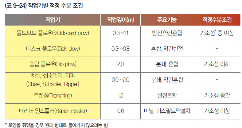·경운 시 수분 조건 : 시설 재배 연작지의 경우 일반적으로 사질토로 염분이 많고 유기물이 적고 휴작 기 동안 관수를 하지 않기 때문에 건조하다. 그러므로 경운 작업 시 단립화되기 쉽기 때문에 통기성과 투수성이 악화되므로 관수하여 경운하되 점질토의 경우 수분이 많으면 경운이 힘들고 단립구조의 토괴가 형성되므로 주의하도록 한다.