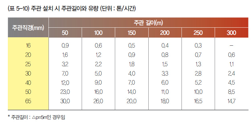 물을 공급하고자 할 경우, 펌프로부터 100m까지는 주관직경이 65mm, 그