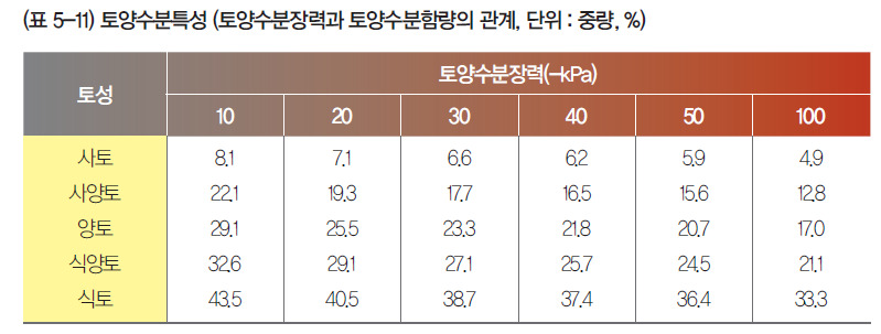 함량(%)이 있다. 토양수분장력은 식물이 토양에서 물을 흡수하는 데 드는 힘을