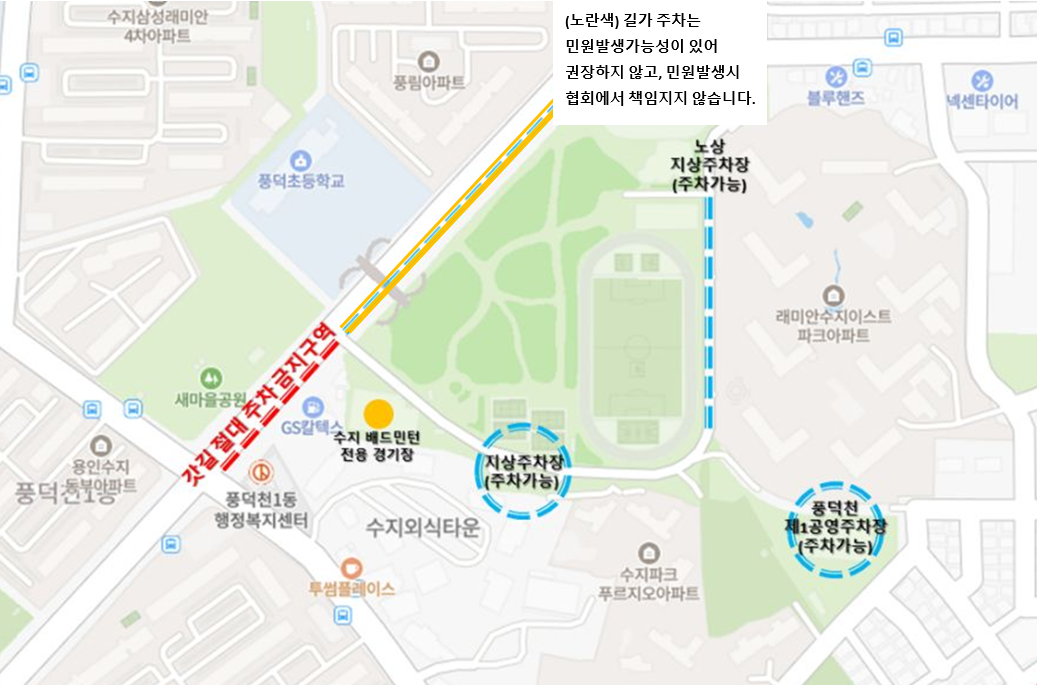 2. 주차: 교회, 주유소, 카센터앞 갓길에는 절대 주차 금지입니다. 수지체육공원 지상주차장과 풍덕공영주차장을 이용해 주시고 되도록 카풀을 이용하여 주시기 바랍니다.