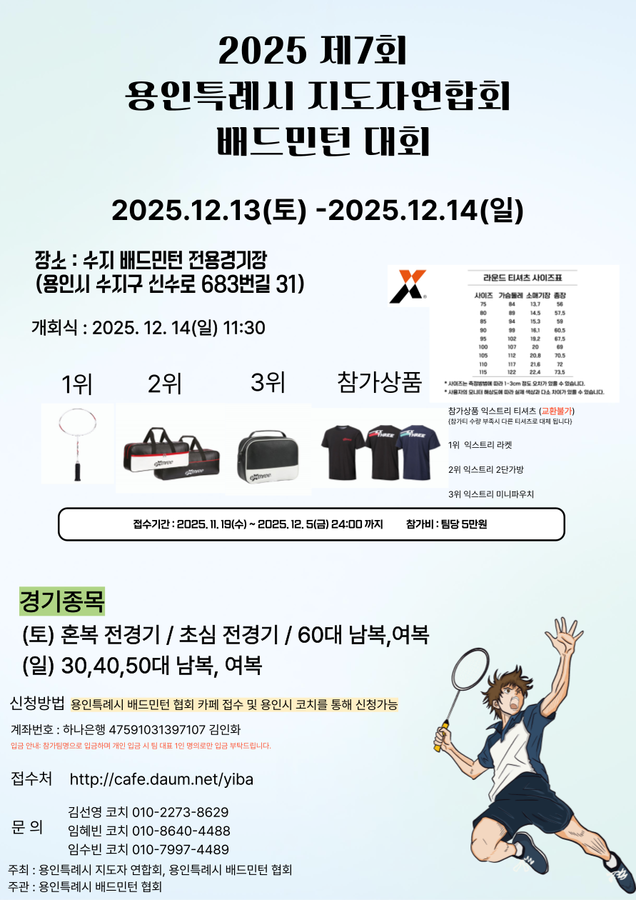 2025 제 7회 용인특례시 지도자연합회 배드민턴대회 (12/13-14) 작성자용배협사무국장/감일주|작성시간25.11.19|조회수766 목록 댓글 2 글자크기 작게가 글자크기 크게가 2025 제 7회 용인특례시 지도자연합회 배드민턴대회 개최를 안내드립니다.2025 제7회 지도자 배드민턴대회 요강.pdf102.47KB2025 제7회 지도자연합회 배드민턴대회 신청서.xlsx45.24KB 첨부파일첨부된 파일이 3개 있습니다. png 파일 포스터.png 다운로드 pdf 파일 2025 제7회 지도자 배드민턴대회 요강.pdf 다운로드 xlsx 파일 2025 제7회 지도자연합회 배드민턴대회 신청서.xlsx 다운로드 다음검색 현재 게시글 추가 기능 열기 북마크 공유하기 신고 센터로 신고 댓글 댓글 2 댓글쓰기 답글쓰기 댓글 리스트 작성자서농클럽/김봉한 회장 | 작성시간 25.11.21 사무국장님 참가신청서 파일이 없는것 같습니다. 답댓글 작성자용배협사무국장/감일주 작성자 본인 여부 작성자 | 작성시간 25.11.21 업로드 했습니다. 감사합니다. 댓글 전체보기