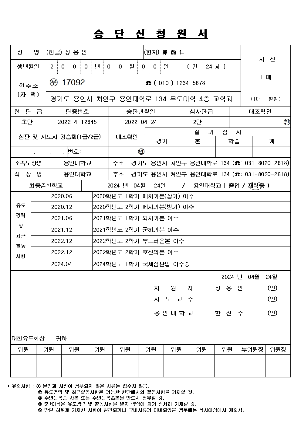 위내용처럼 승단원서, 개인정보동의서 작성할것 날짜는 그대로 두고 작성할것