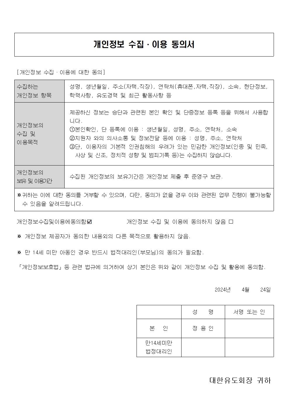 유도학과, 유도경기지도 승단원서, 개인정보동의서 작성법