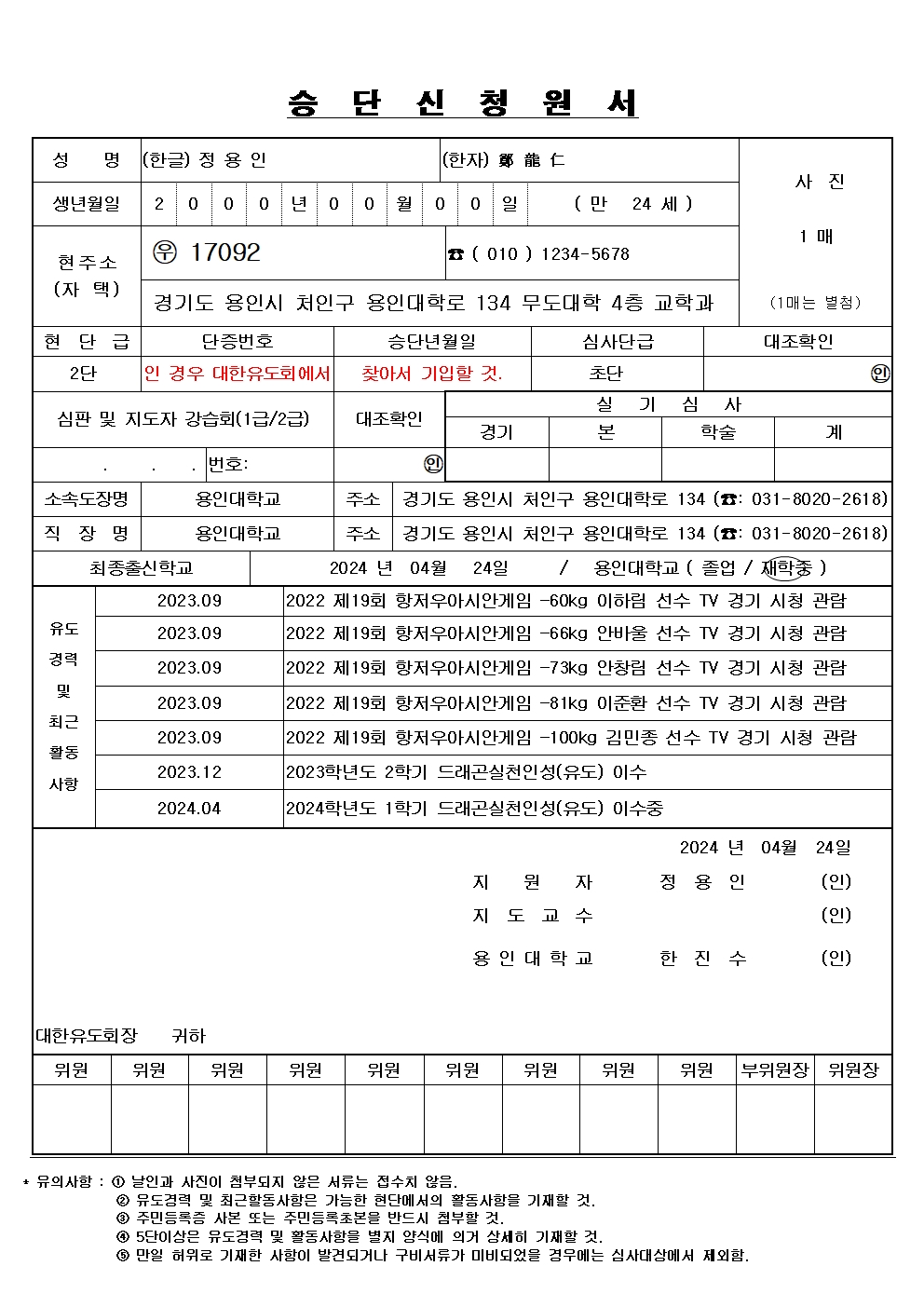 승단 신청서 2부, 개인정보동의서 1부, 재학증명서 1부, 반명함사진 2매, 본인도장