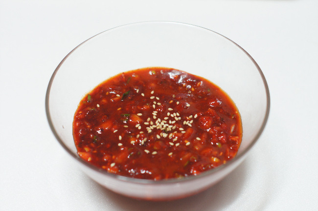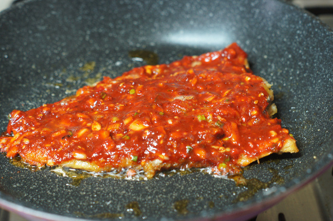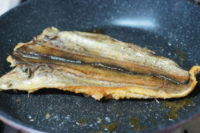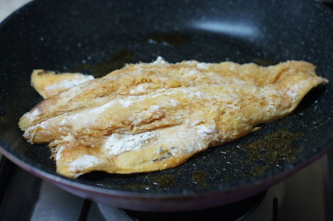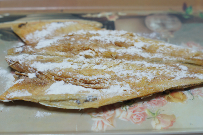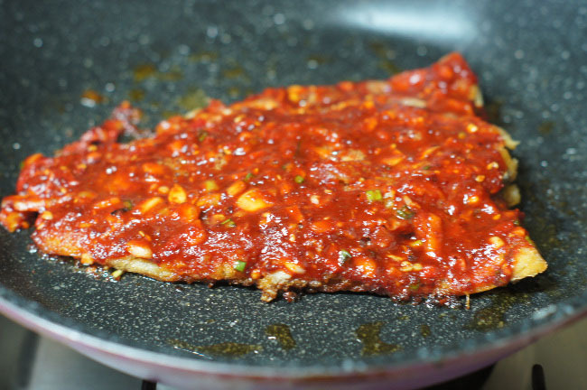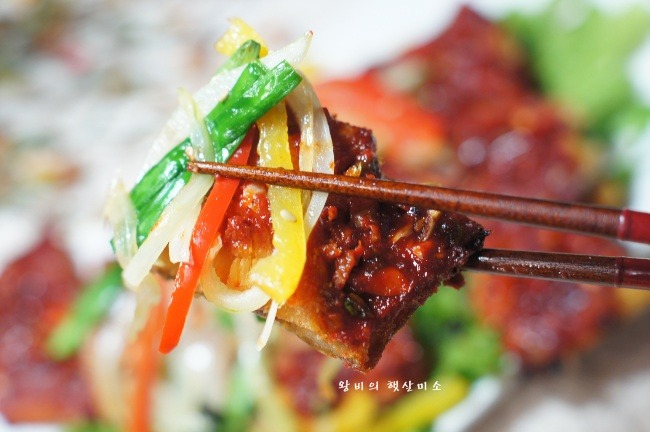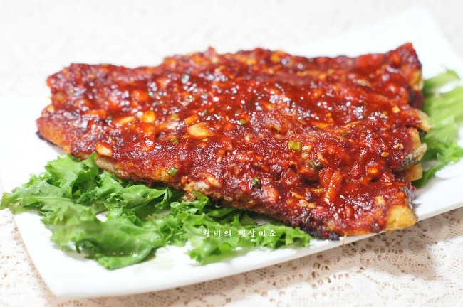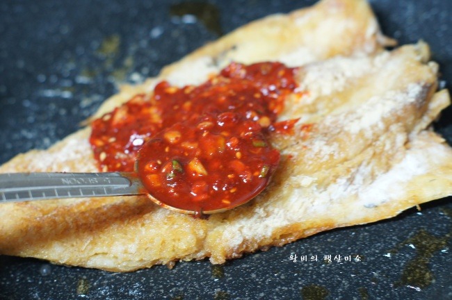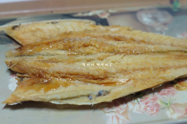 황태 손질 하기 ◇ 1...황태는 머리와 꼬리를 잘라 떼어 놓고요.(황태머리는 나중에 국물우려서 홍합탕 끓일때 사용할겁니다) 잔 가시 보이는것 있어 모두 떼어냈고요 흐르는 물에 한번 씻어서 물기를 꾸욱 짭니다.. 황태가 물을 먹으니 스펀지 처럼 금새 부들부들 해 졌어요 2.소금 아주 약간 후추가루,참기름을 황태에 발라 5분정도 둡니다. 3.떡 방앗간에 파는 쌀가루 말고~마트에 파는 쌀가루를 솔솔 뿌려 줍니다. 양념장 1마리 재료..^^* ◇ 고추장 1큰술,고추가루1큰술,청주 1큰술,설탕1큰술,꿀1큰술,진간장½큰술,양파 ¼,홍고추조금,파인애플 두쪽 다진마늘두개,다진파조금,깨소금,후추,소금약간 황태가 두마리면 양념장을 두배로 늘리면 됩니다 황태 굽기 ◇ 4.. 프라이팬에 참기름을 두르고 약불로 뒷면부터 구워 줍니다. 익으면서 황태가 오그라 들어요 한번 뒤집어 주고 익혀줍니다.. 왠만큼 익었다 싶음 양념장을 올려줍니다 5...고추장 양념을 고루 입힌뒤에 약불로 익혀 줍니다. 약불로 은근히 익히다 보면 고추장 양념사이로 맛있게 익는 거픔같은 모습이 보인답니다.. 구수하게 익는 냄새가 진동을 한답니다. 야채 볶기 ◇ 황태고추장 양념구이만 먹어도 되는데 야채랑 곁들여 먹기로 했습니다.. 프라이팬에 양파,부추,파프리카등 썰어서 소금 약간만 넣고 가볍게 볶아 주었습니다.. 집에 있는 야채들로 해도 됩니다. 양파와 부추는 가볍게 볶아 먹음 달큼한 맛도 납니다. 사진 찍다 보니 고소한 맛이 진동을 합니다.. 구워서 따뜻할때 먹음 진짜 맛이 좋아요 가위로 잘라서 야채들과 함께 먹는 황태 양념 구이 매콤하면서 고추장 양념에 파인애플이 들어가서 맛이 좋답니다.
