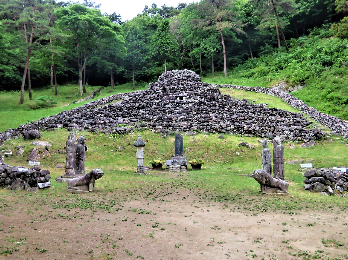 | 왕산은 정상에서의 조망과 필봉산으로 이어지는 날등의 철쭉과 억새밭이 좋은 산이다. 산자락에는 가락국의 마지막 왕인 구형왕릉이 있다. 산행 기점은 덕양전으로, 그 옆의 콩크리트 건물을 20여분 걸으면 구형왕릉이 나온다.왕릉 뒷길을 따라 30여분 오르면 묘 1기가 나온다. 여기서 40여분 정도 오르면 또 다른 묘와 갈림길이 나오는데 왼쪽길로 들어선다. 철쭉길로 뒤덮인 솔숲길을 지나면 억새가 뒤덮인 주능선이다. 오른쪽으로 오르면 왕산 정상이다. 왕산만 산행하려면 되돌아가 898봉으로 하산해 망경대로 내려간다. 정상에서 필봉산 가는 능선에는 철쭉이 많다. 동쪽 능선을 타고 40여분 걸으면 필봉산이다. 필봉산에서 하산은 능선을 따라 특리다리로 하산하거나 정상에서 오른쪽길을 따라 향양리로 하산한다. 필봉산(848M) 정상은 온통 바위투성이로서 사방이 날카로운 벼랑 이며 산림감시원 초소가 있으며 주변 조망이 일품이다. 멀리서 보 면 여자의 젖가슴 같다하여 일명 유두봉(乳頭峰)이라고도 하는데 산 청은 옛부터 선비의 고장이다 |