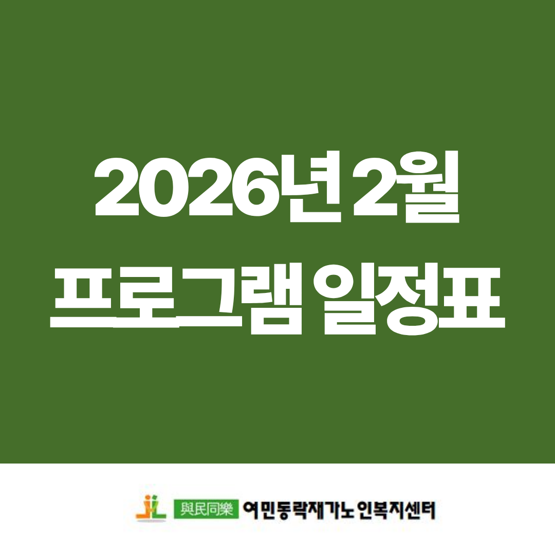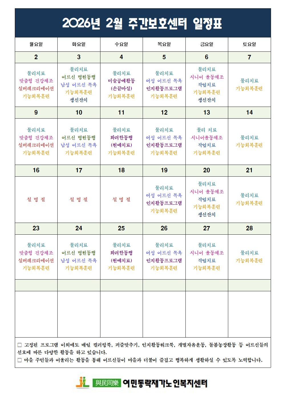 2026년 2월 프로그램 일정표(주간보호) 작성자與民同樂 머슴|작성시간26.02.02|조회수7 목록 댓글 0 글자크기 작게가 글자크기 크게가 다음검색 현재 게시글 추가 기능 열기 북마크 공유하기 신고 센터로 신고 댓글 댓글 0 댓글쓰기 답글쓰기 댓글 리스트