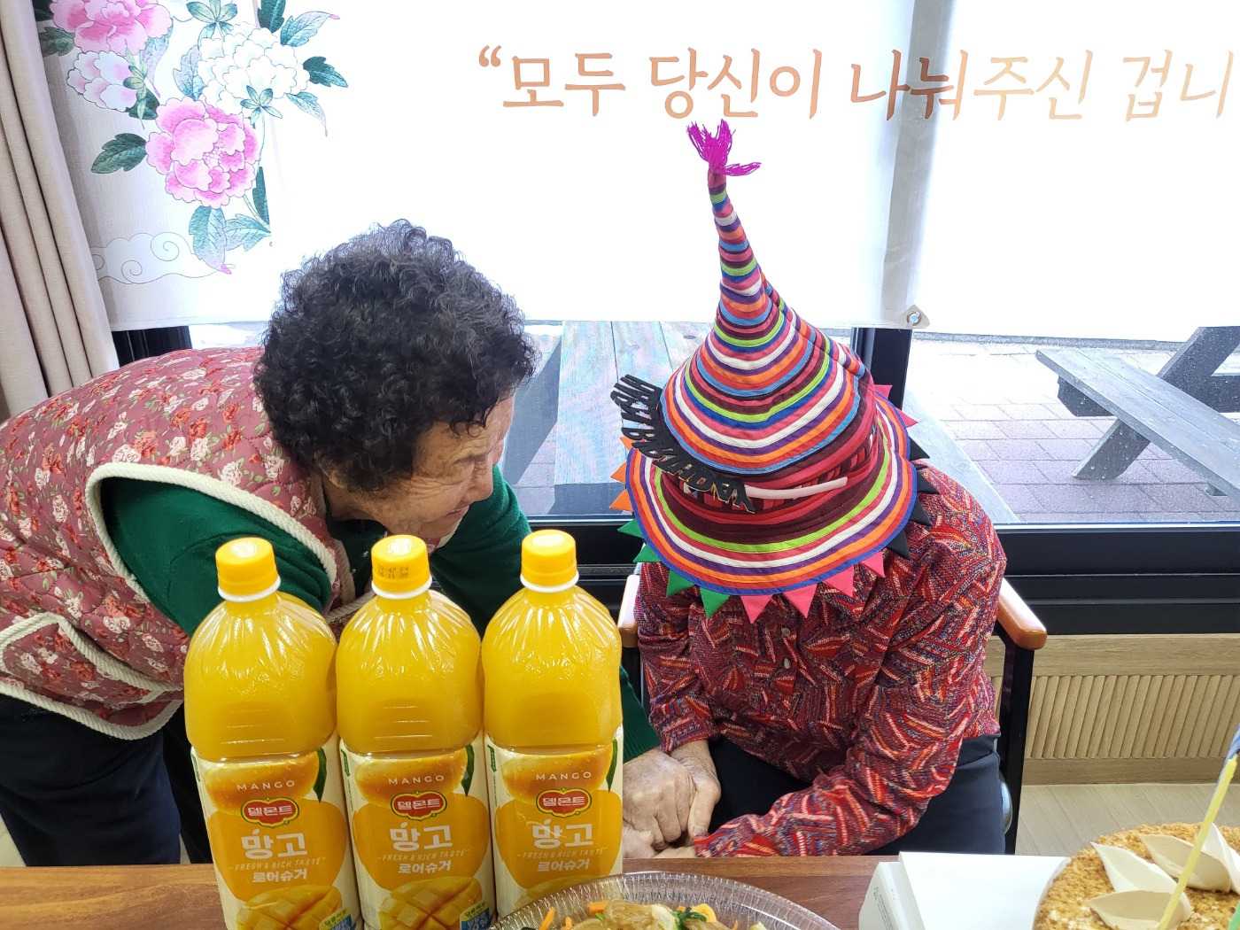 어르신께서 생신을 맞이하여, 과일과 음료 등을 준비해주셨습니다.
