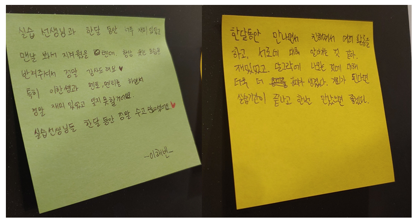 실습의 마지막날, 실습선생님들을 배웅하고 싶다며 연락이 왔습니다. 돌아가며 편지를 적고 있는데 꼭 만나서 주고싶다고 말입니다.