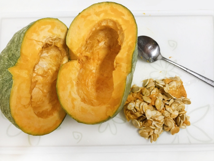 단호박을 반으로 가른 후 수저로 씨를 긁어내고