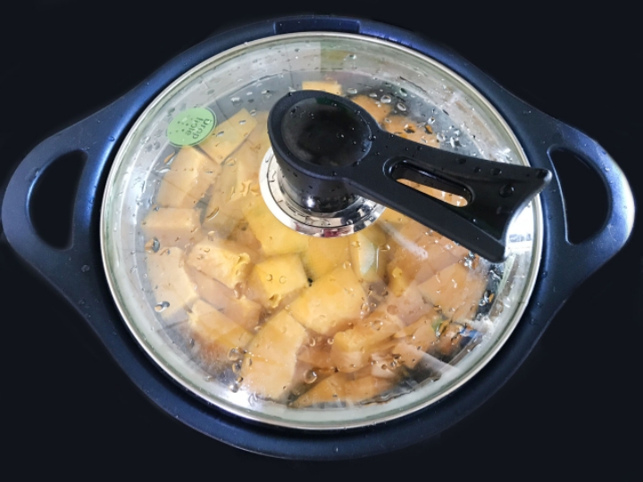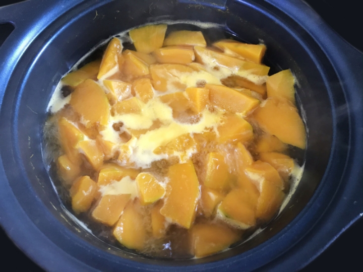 단호박과 물 6컵을 냄비에 넣고 뚜껑을 덮어 중간 불에 20분 정도 끓이고 난 후