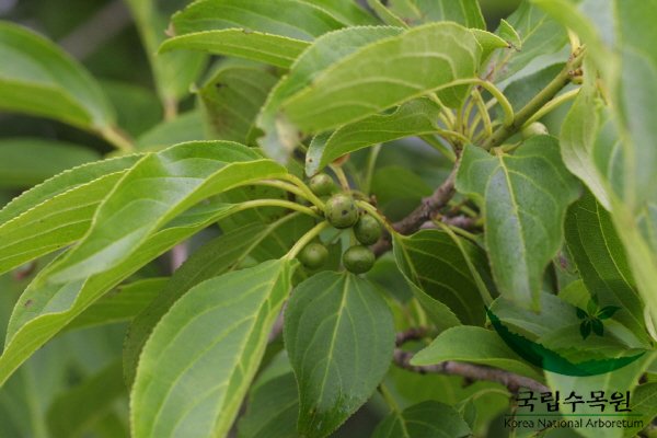 꽃은 단성화(單性花)로 가지 밑쪽의 잎겨드랑이에 1∼2개씩 달리고, 수술에 퇴화된 암술이 있으며, 암꽃에는 꽃밥이 없는 수술이 있다. 꽃받침은 달걀 모양이다. 5∼6월에 청록색의 꽃이 핀다. 열매는 둥글고 9~10월에 검은색으로 익으며 지름이 7mm 정도의 원형이며 2개의 씨가 들어 있다. 가을에 열매를 채취하여 밖에 묻어두었다가 봄에 파종한다.