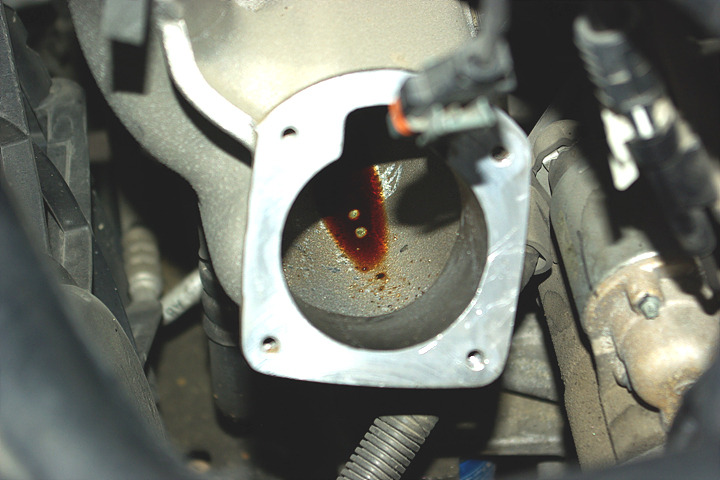 스로틀 바디를 적시고 남은 엔진 오일이 흡기다기관에 고여 있는 것이다.