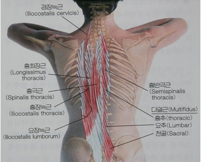 척추기립근을 위로 추적해보면 장늑근, 최장근, 극근의 3개근육으로 나뉘어지는 것을 알 수 있다.